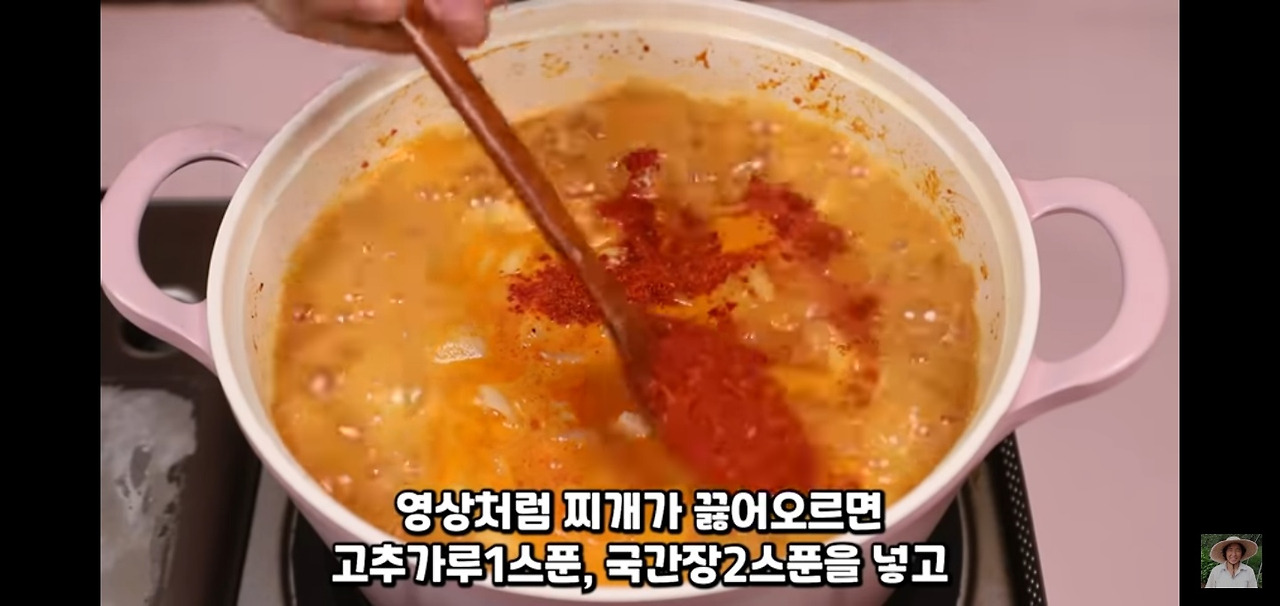 찌개가 끓어오르면 고추가루 1스푼과 국간장 2스푼을 넣어 주세요. 그 후 불을 중불로 줄여 주세요.
