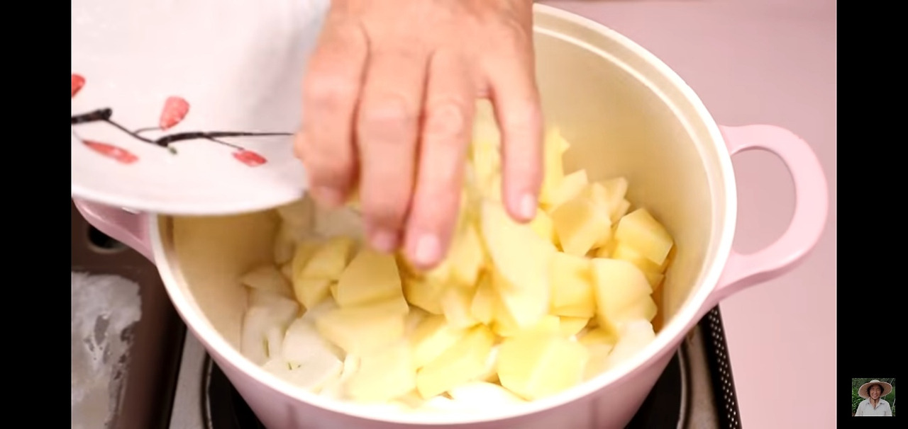 양파에서 달콤한 향이 나기 시작하면, 감자를 넣고 1분간 함께 볶아 주세요.