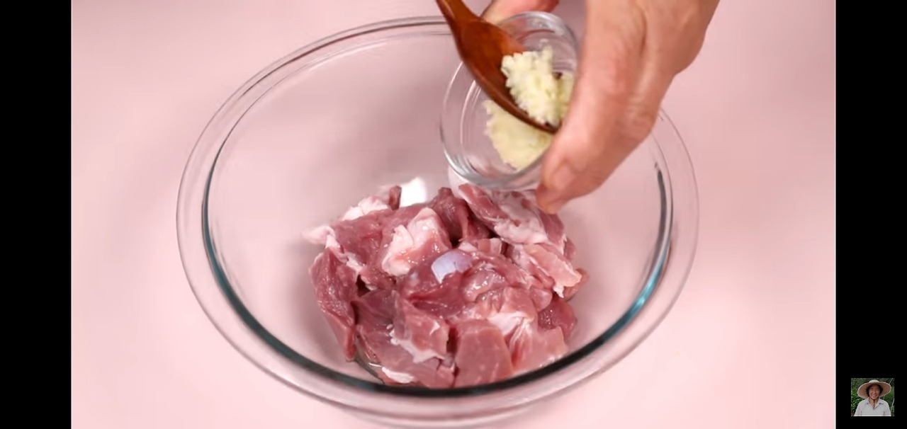 먹기 좋은 크기로 썰고, 키친타올로 핏물을 제거한 돼지고기에 맛술 2스푼과 다진 마늘 반 스푼을 넣어 주세요.