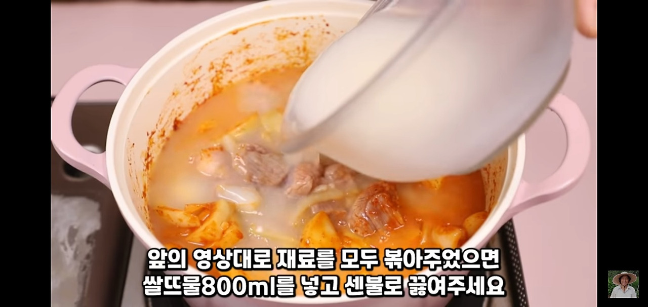 볶은 재료에 쌀뜨물 800ml를 붓고, 센 불에서 끓여 주세요.