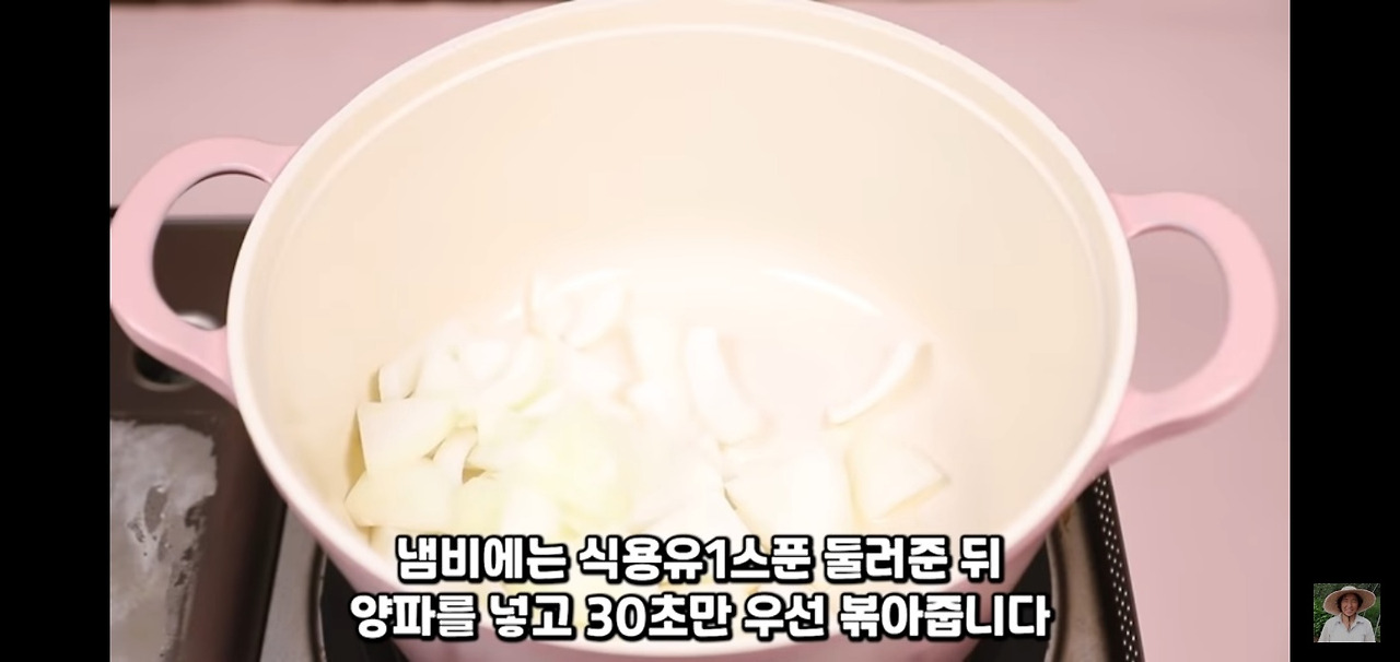 이제 고추장찌개에 들어갈 재료들을 볶아 볼게요. 냄비에 식용유를 적당히 두르고 양파를 넣은 뒤, 30초 정도 볶아 주세요. 불은 중불로 맞춰주시면 됩니다!