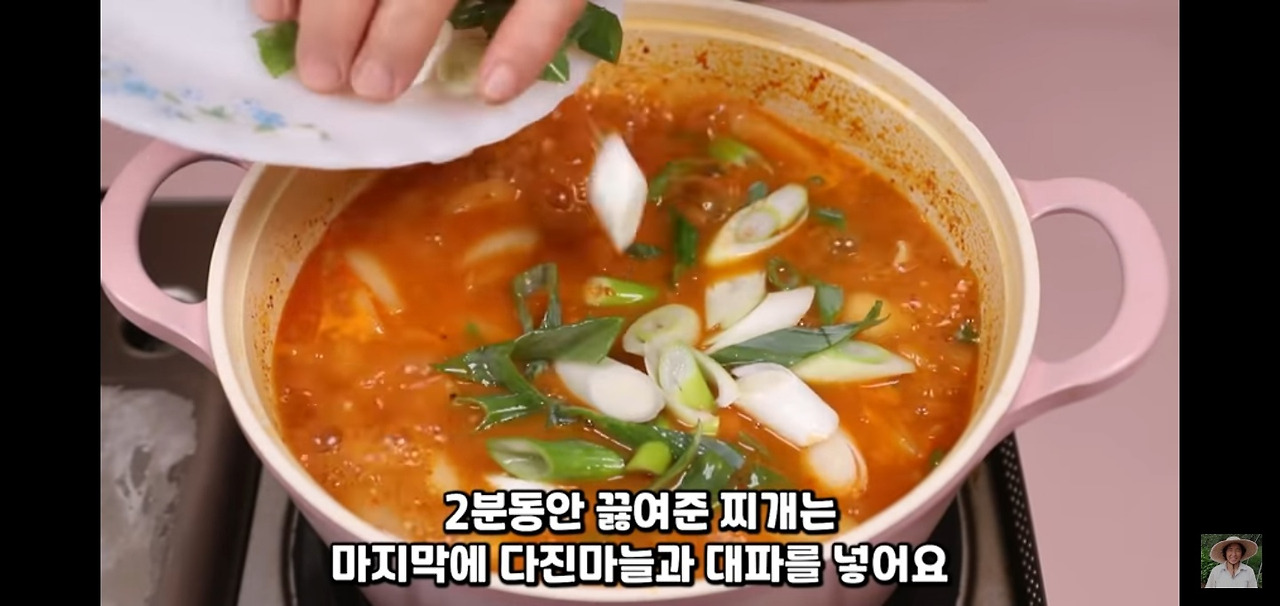 그 후 대파를 넣고 30초간 끓여 주면, 오늘의 고추장찌개가 완성됩니다!