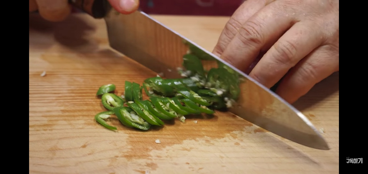 배추 된장국에 은은한 매운 향을 더해줄 마늘 5알은 곱게 다져주시고, 청양고추 5개는 어슷하게 썰어주세요.