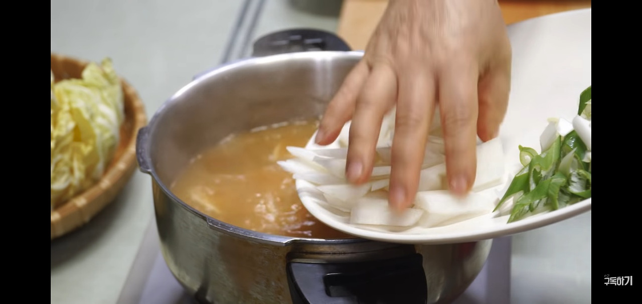 이제 중간 불로 올린 뒤, 육수가 다시 끓어오르면 미리 썰어둔 무를 넣어주세요.