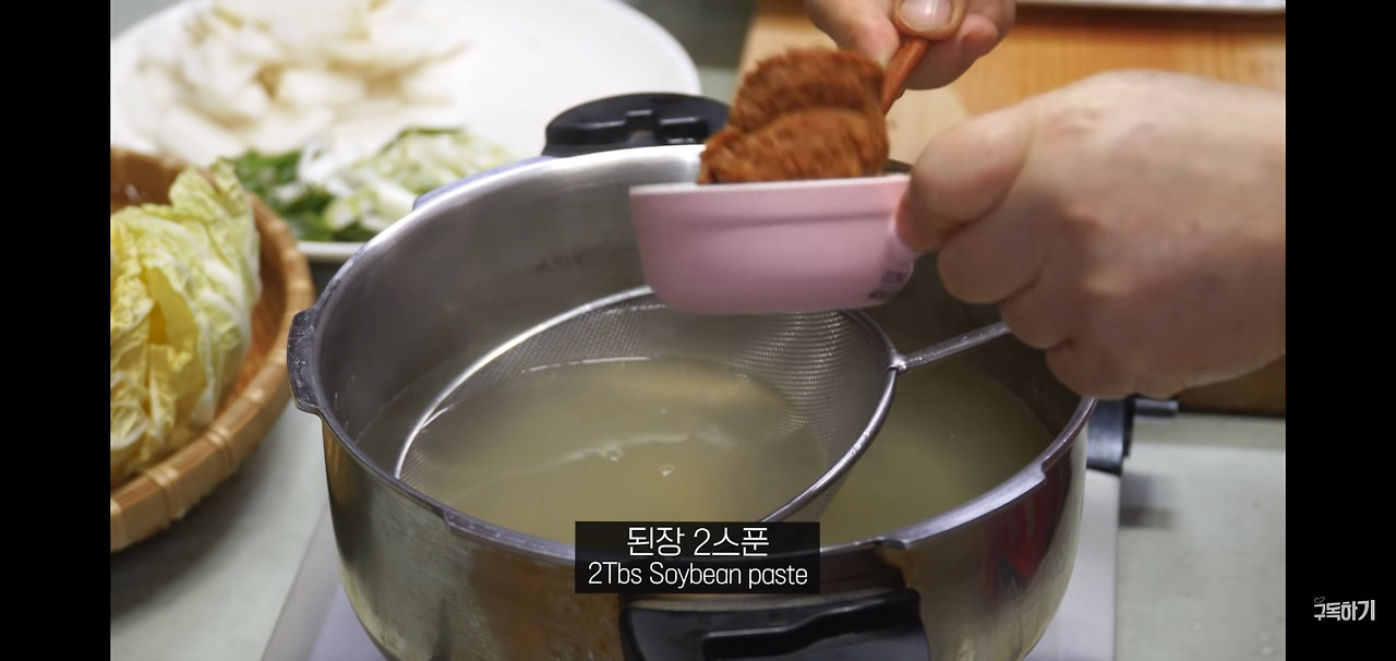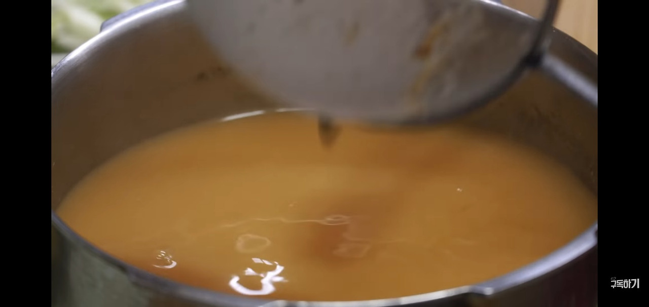 먼저, 육수에 된장 2스푼을 넣어주세요. 채를 사용해 된장을 걸러가며 비벼 넣으면 더욱 부드럽게 풀립니다. 이 과정에서 생긴 콩 찌꺼기는 영양가 있는 성분이니 버리지 말고 그대로 사용하시는 것이 좋습니다.
