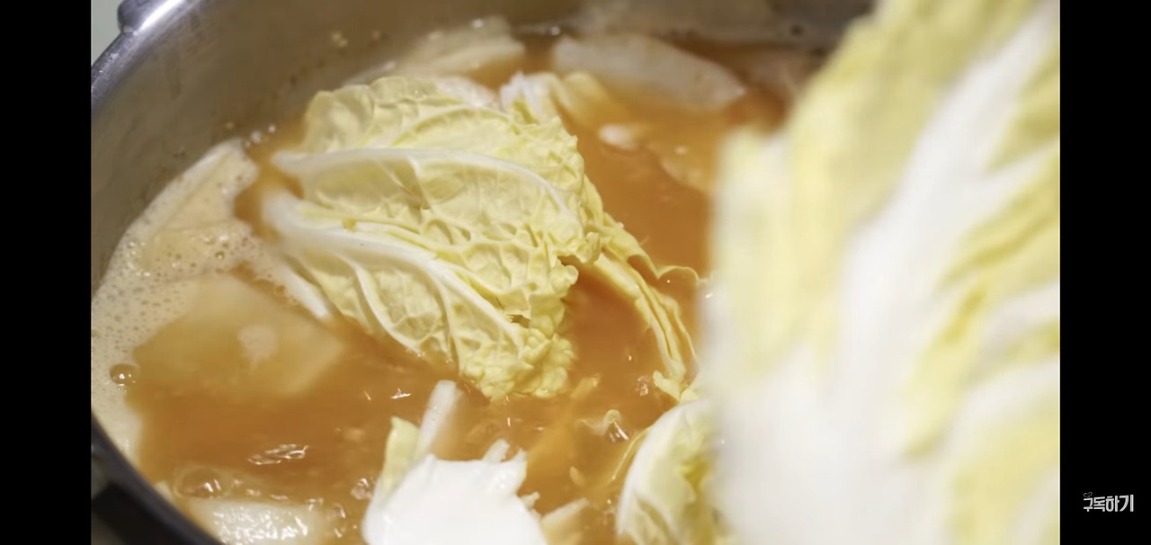 무를 넣고 한 번 끓인 후, 배추는 손으로 찢어서 넣어주세요. 칼로 썰기보다는 결대로 찢는 것이 모양이 더 예쁘답니다.
