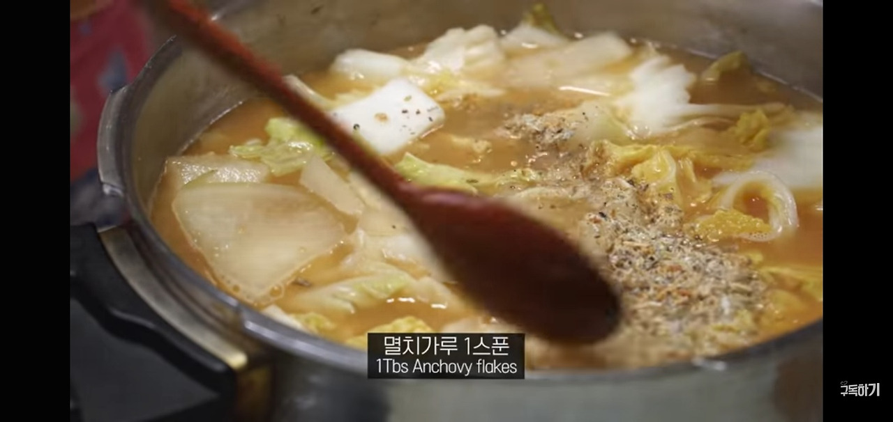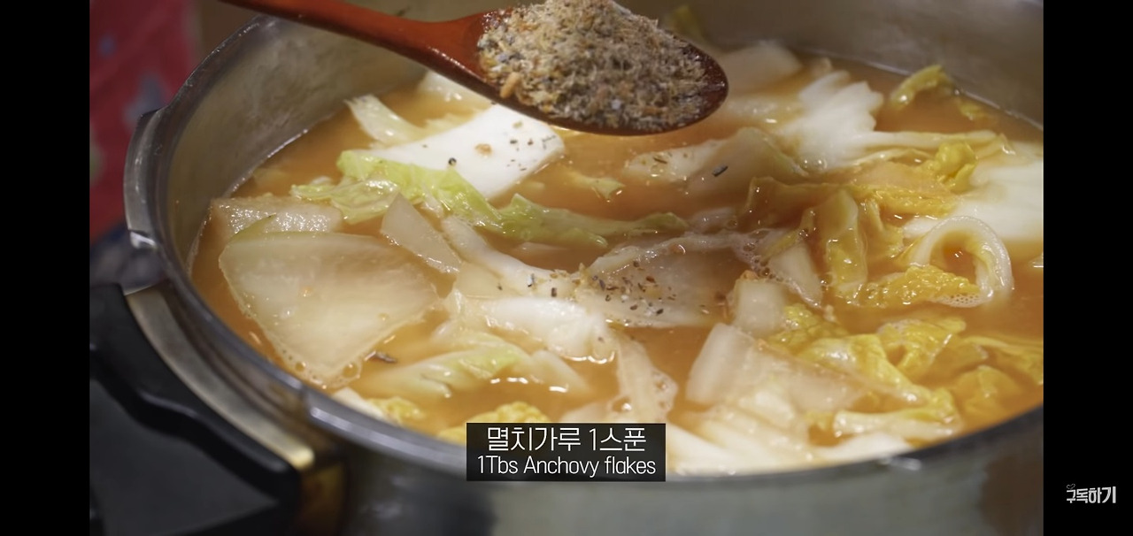 계속해서 끓이다가, 무가 어느 정도 투명해지면 배추 된장국에 깊은 감칠맛을 더해줄 멸치가루 1스푼을 넣어주세요. 멸치는 갈아서 사용하시면 됩니다.