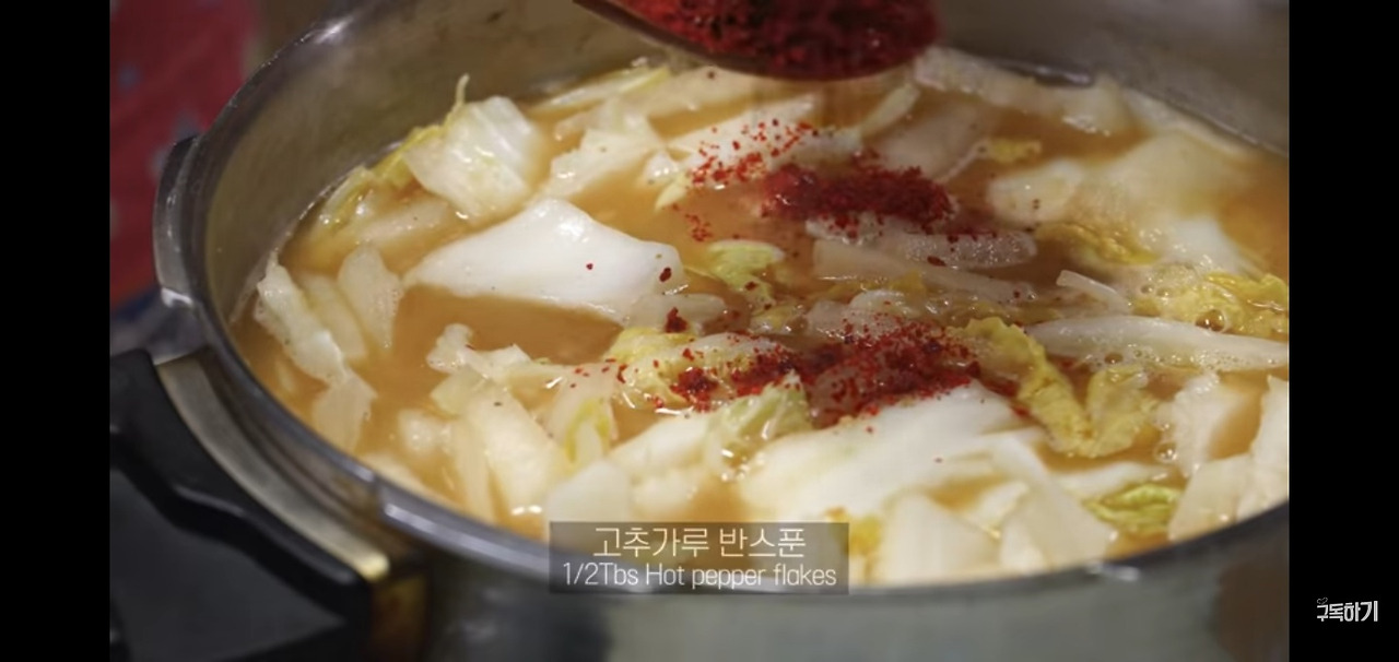 그다음, 고추가루 반 스푼을 넣어 적당히 칼칼한 맛과 함께 국물의 색을 맞춰주세요.
