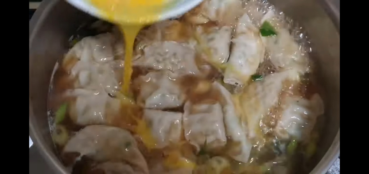 이어서, 만둣국에 고소한 맛을 더해줄 참기름을 반 스푼 정도 넣고, 계란을 골고루 펼쳐주세요.