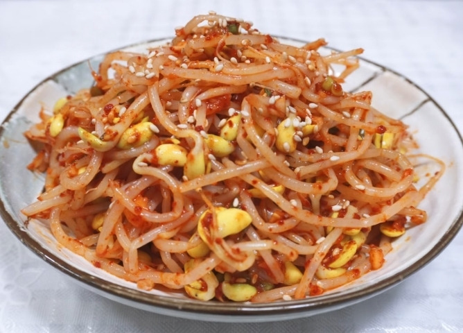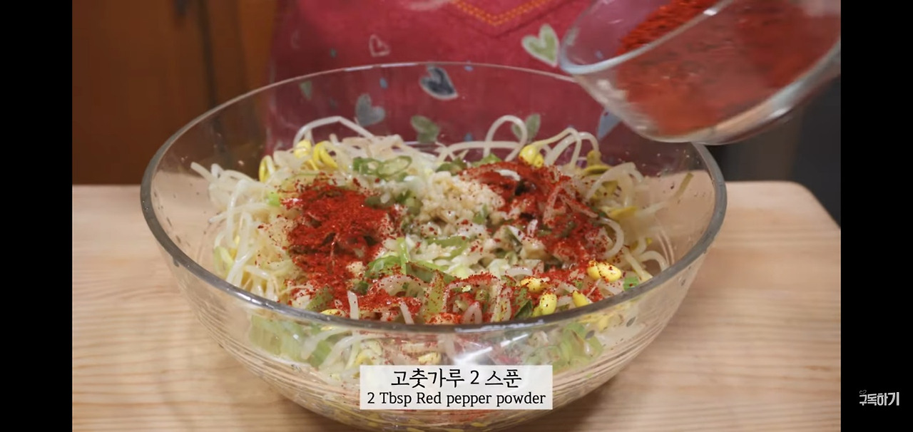 콩나물 무침에 매콤한 맛과 화사한 색감을 더하려면 고춧가루 두 스푼과 참깨를 뿌려주시면 좋습니다.