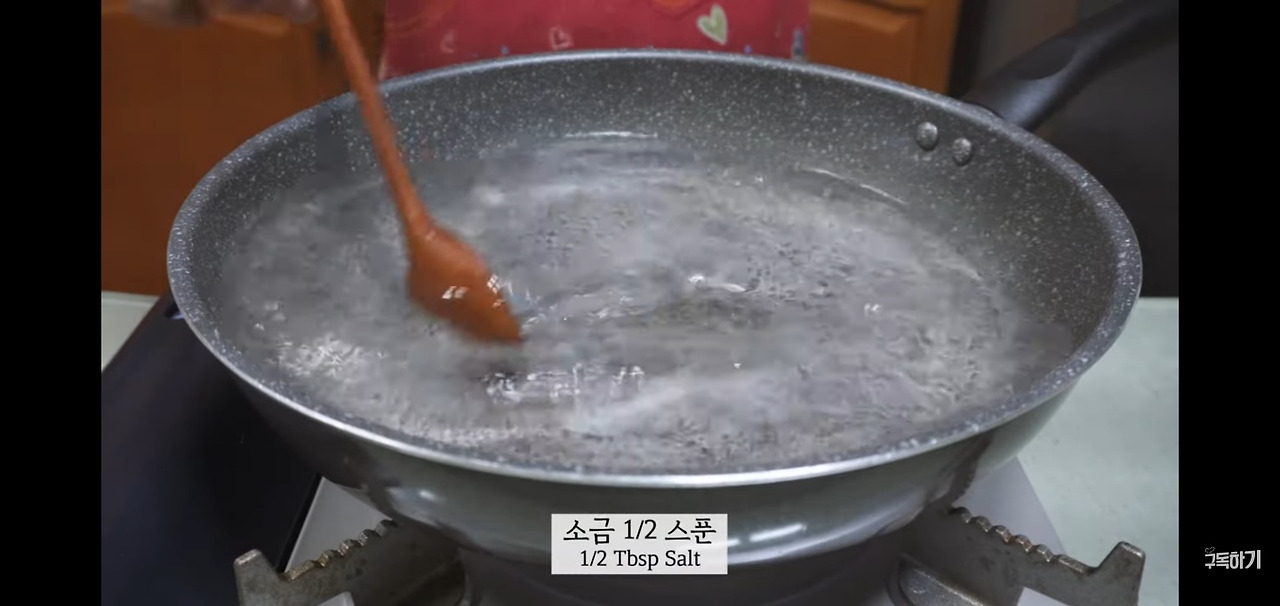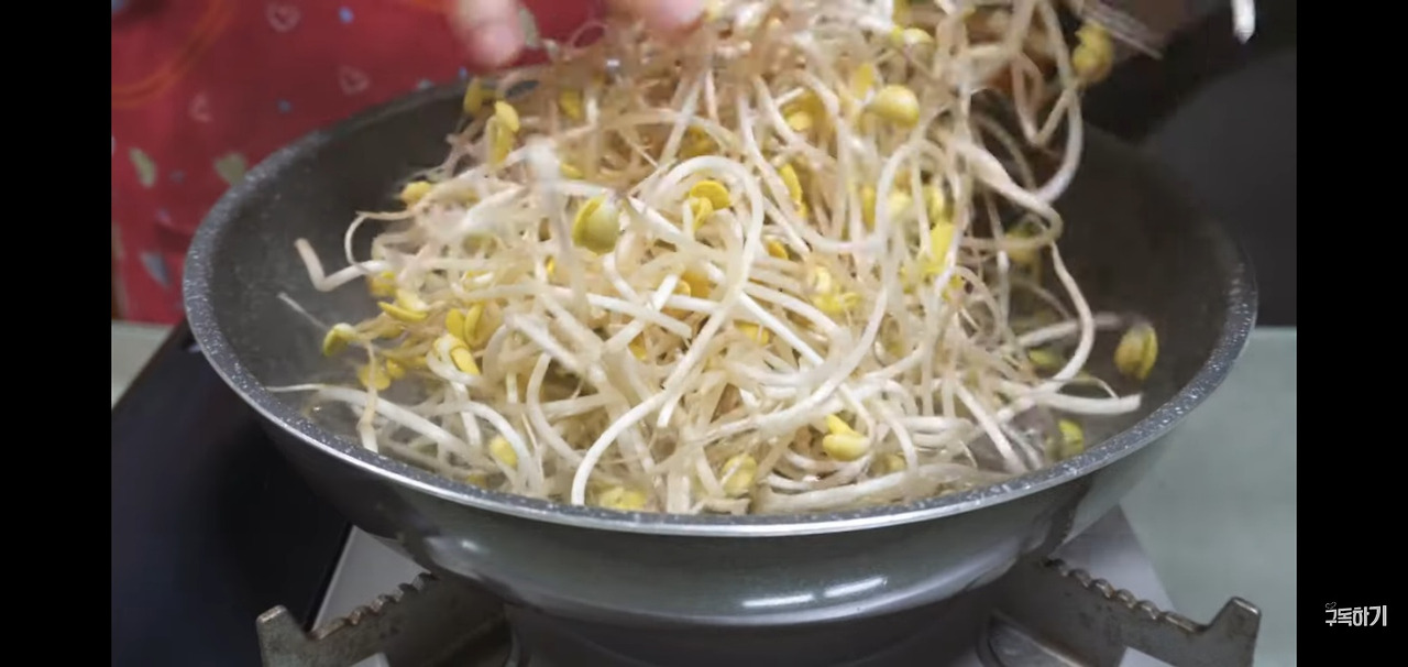 구운 소금 반 스푼을 넣고, 물이 끓기 시작하면 콩나물을 넣어주세요.