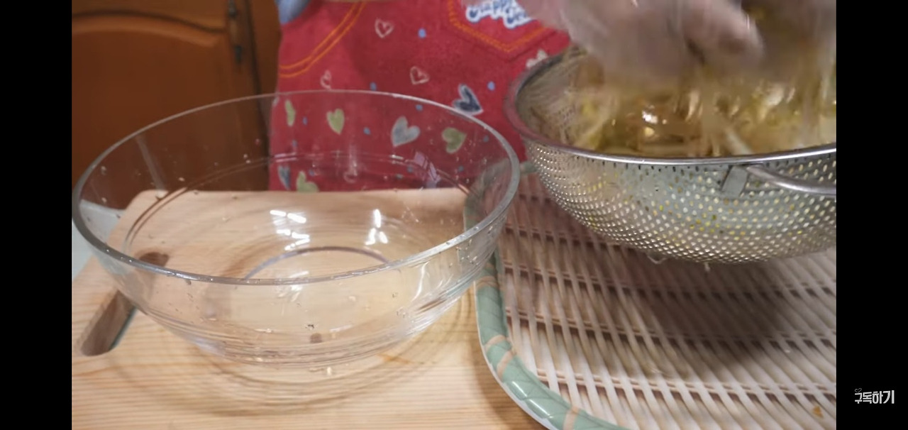 삶아낸 콩나물은 바로 찬물에 담가 식혀주신 후, 체에 올려 물기를 충분히 빼주세요.