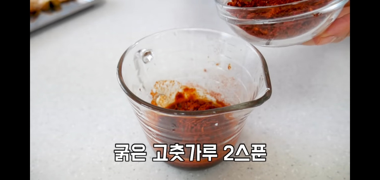 황태구이에 칼칼한 맛과 먹음직스러운 붉은 색감을 더해줄 고운 고추가루 1스푼과 굵은 고추가루 2스푼을 넣어 주세요.