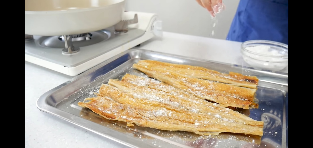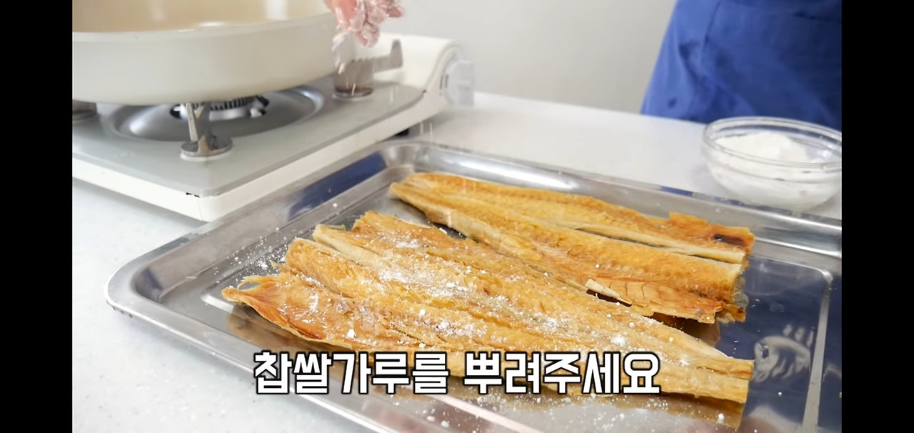 그다음, 황태 표면에 찹살가루를 뿌려주시면 더 바삭하고 맛있는 황태구이를 즐기실 수 있습니다.