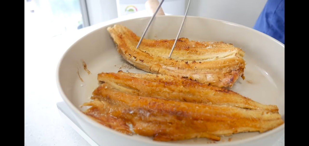 이제 황태를 구워보겠습니다. 팬에 식용유를 적당히 두르고 중불로 예열한 뒤, 황태의 배 부분부터 구워 주세요. 껍질을 먼저 구우면 황태가 너무 쪼그라들어 나중에 고르게 익지 않을 수 있으니 주의해 주세요.