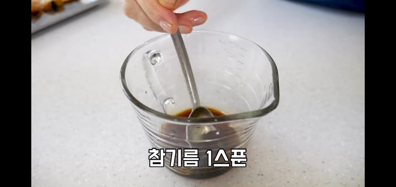 요리에 윤기를 더해줄 물엿 1스푼과 고소한 참기름 1스푼을 넣어 주세요.
