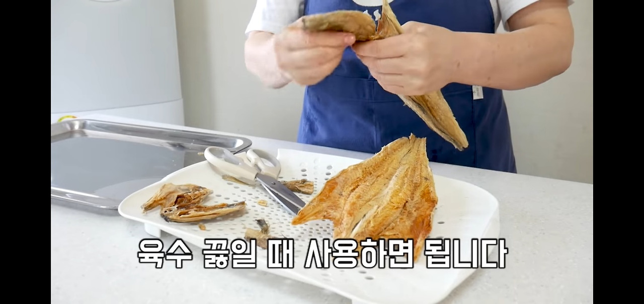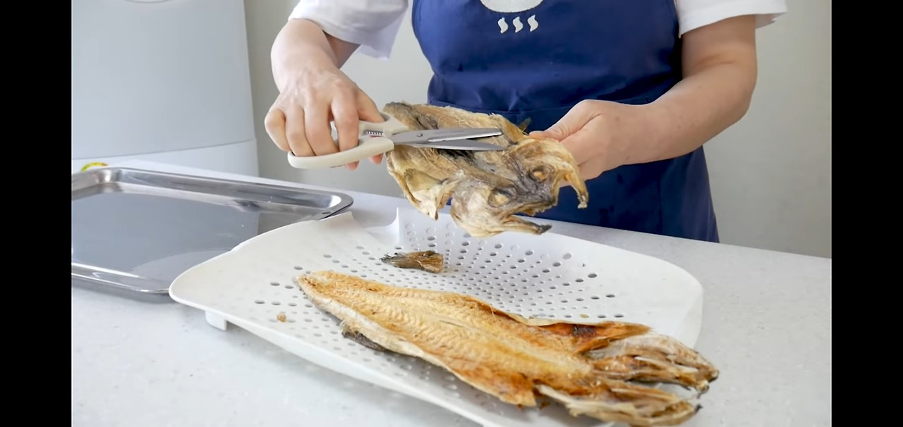 먼저, 드실 때 불편함을 줄 수 있는 황태의 지느러미와 꼬리 부분을 가위로 잘라 깔끔하게 정리해 주세요.