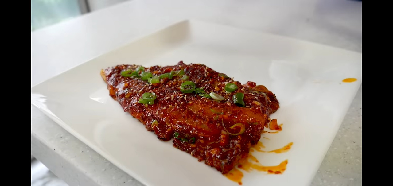 이렇게 오늘의 황태 양념구이 황금레시피로 완성된 황태구이가 준비되었습니다. 고명으로 아까 썰어둔 대파의 초록 부분을 예쁘게 올려주면 더욱 맛있어 보입니다!