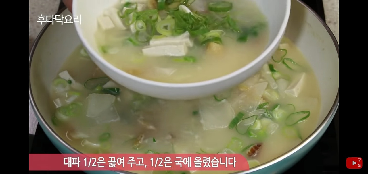 무가 투명해질 때까지 중불에서 잘 끓인 후, 준비해둔 두부와 대파를 넣어주세요.