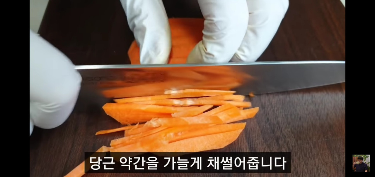 대패삼겹살 숙주볶음에 색감을 더해줄 당근을 조금 준비해 가늘게 채 썰어주세요.