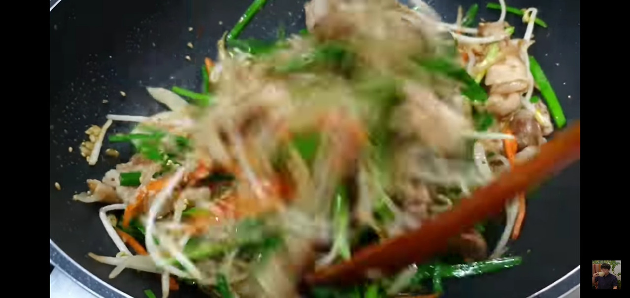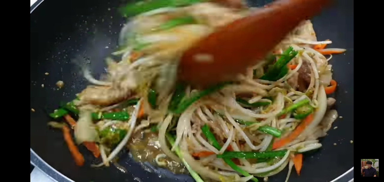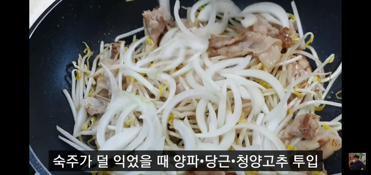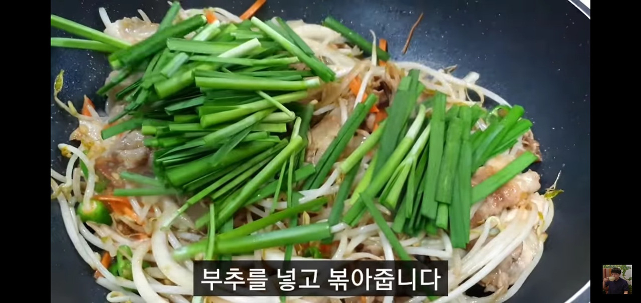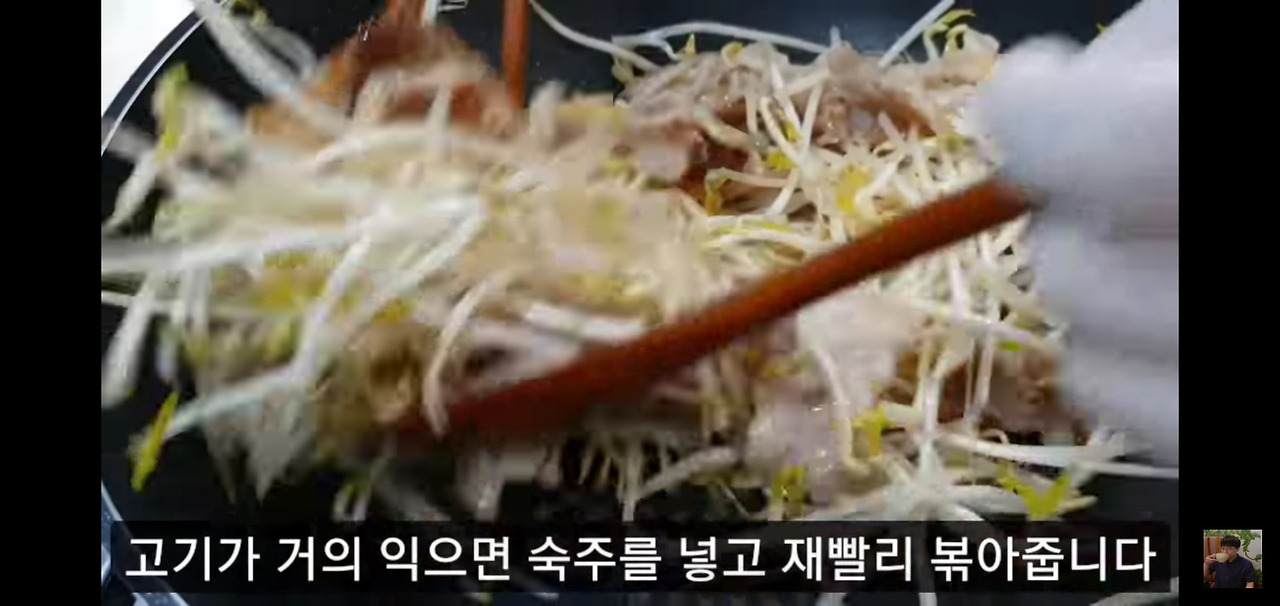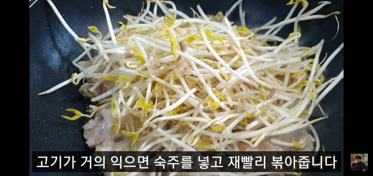 돼지고기가 거의 익었다면, 준비해둔 숙주를 넣고 강한 불에서 재빨리 볶아주세요.