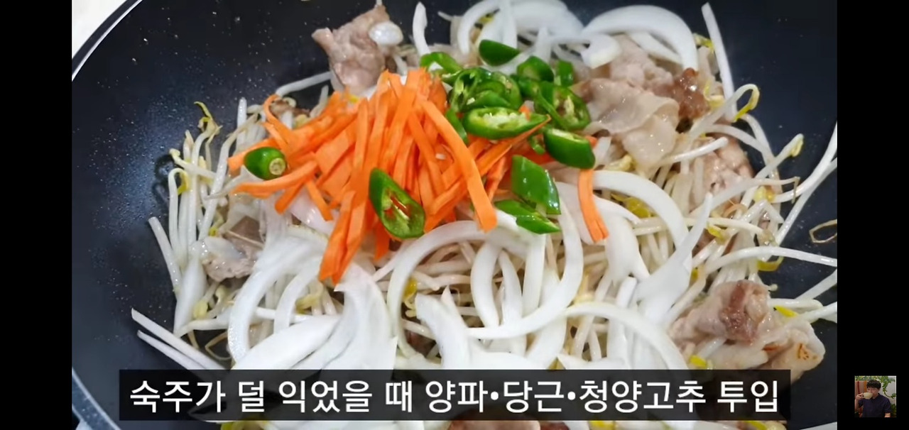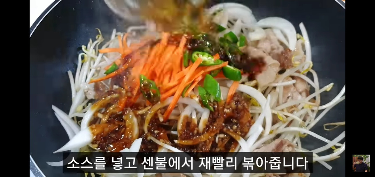 숙주가 살짝 숨이 죽기 시작하면 양파, 당근, 청양고추, 그리고 미리 준비한 대패삼겹살 숙주볶음 소스를 넣고 계속해서 강불로 볶아주세요.