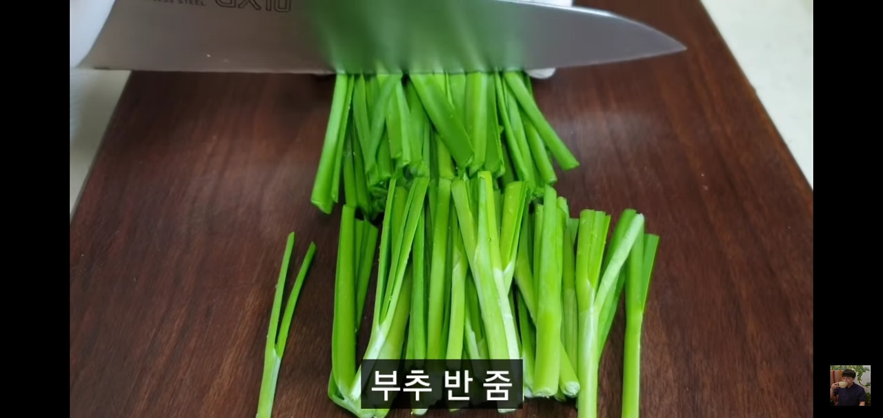 그다음, 부추 반 줌을 먹기 좋은 길이로 썰어주세요.