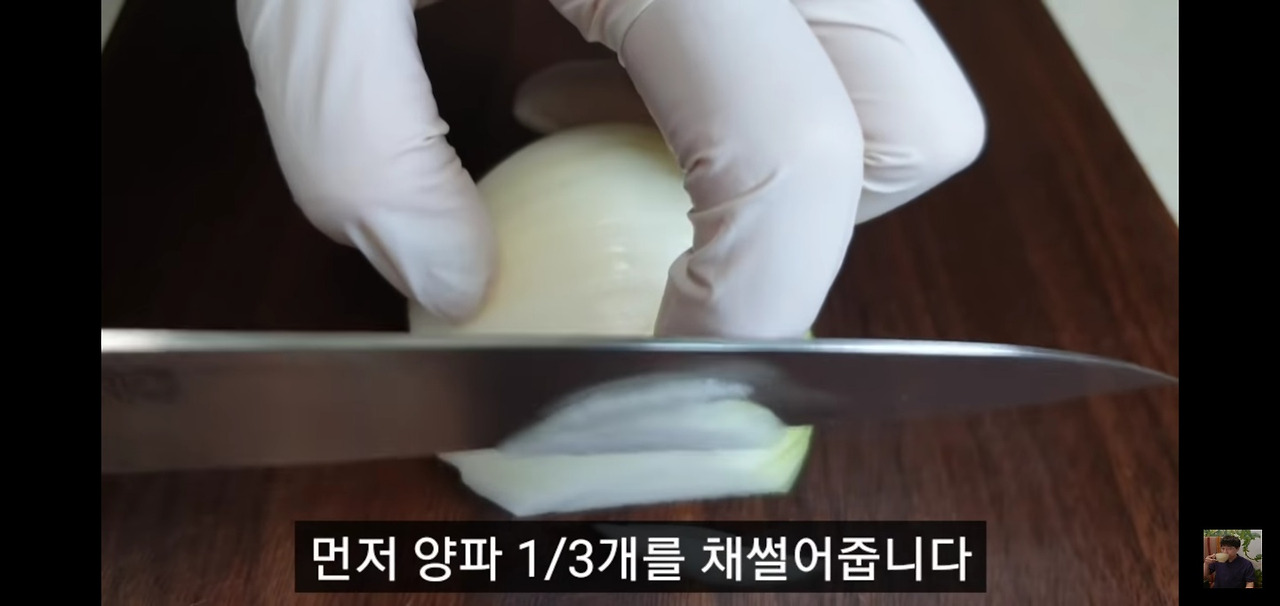 먼저 양파 반 개를 얇게 채 썰어주세요. 양파를 좋아하신다면 양을 조금 더 추가하셔도 괜찮습니다.