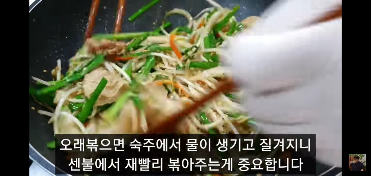 불을 너무 낮추면 숙주에서 물이 나와서 국물이 많아질 수 있어요. 강한 불을 유지하면서 타지 않도록 빠르게 볶는 게 핵심이에요!
