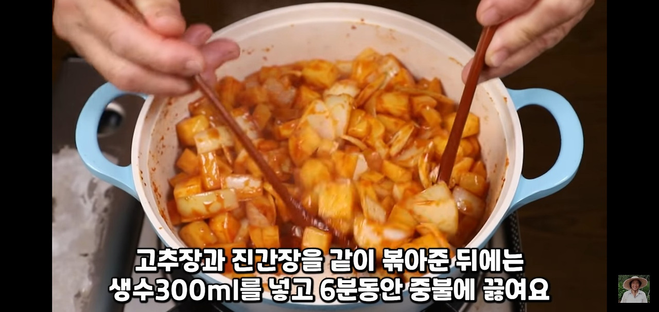 고추장과 간장을 넣고 잘 섞은 후, 생수 300ml를 넣고 6분 동안 볶아주세요. 만약 감칠맛 나는 멸치 육수를 사용하면, 더 맛있는 감자 짜글이를 즐길 수 있답니다!