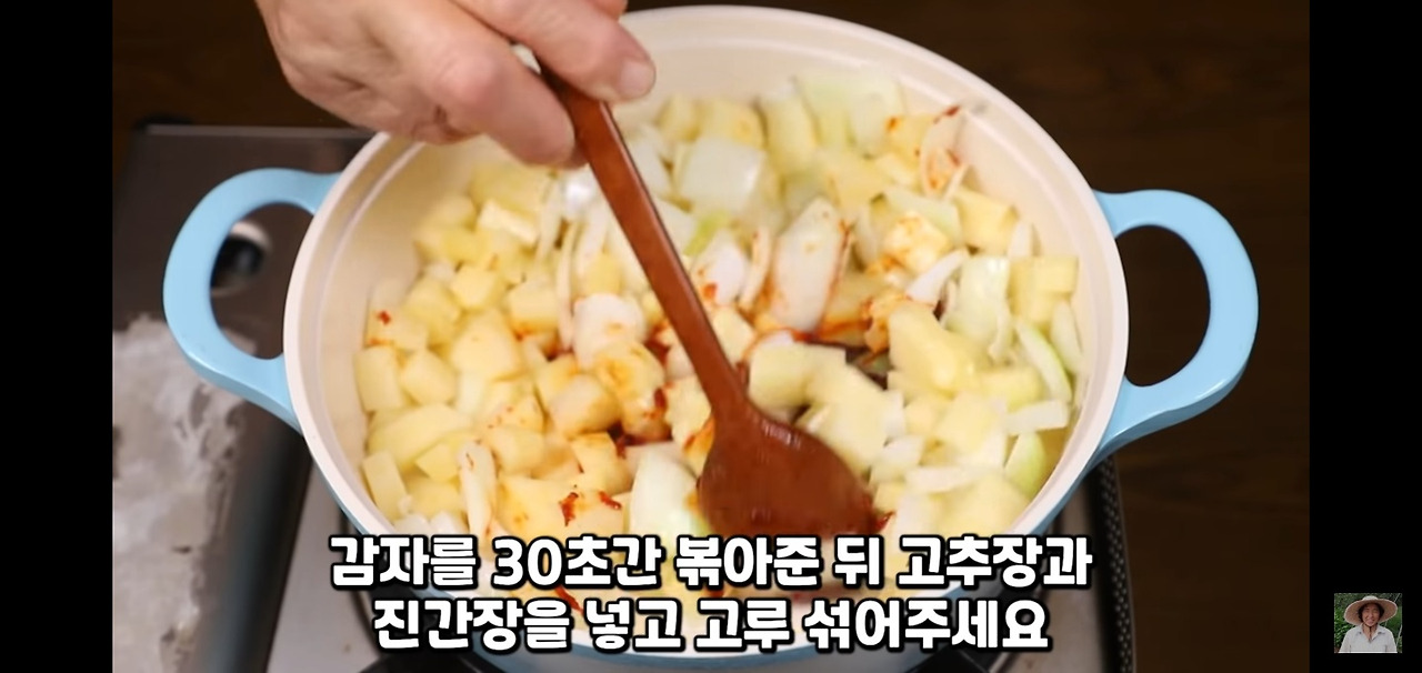 감자를 30초간 볶은 후, 고추장 1스푼을 넣고 함께 볶아주세요.