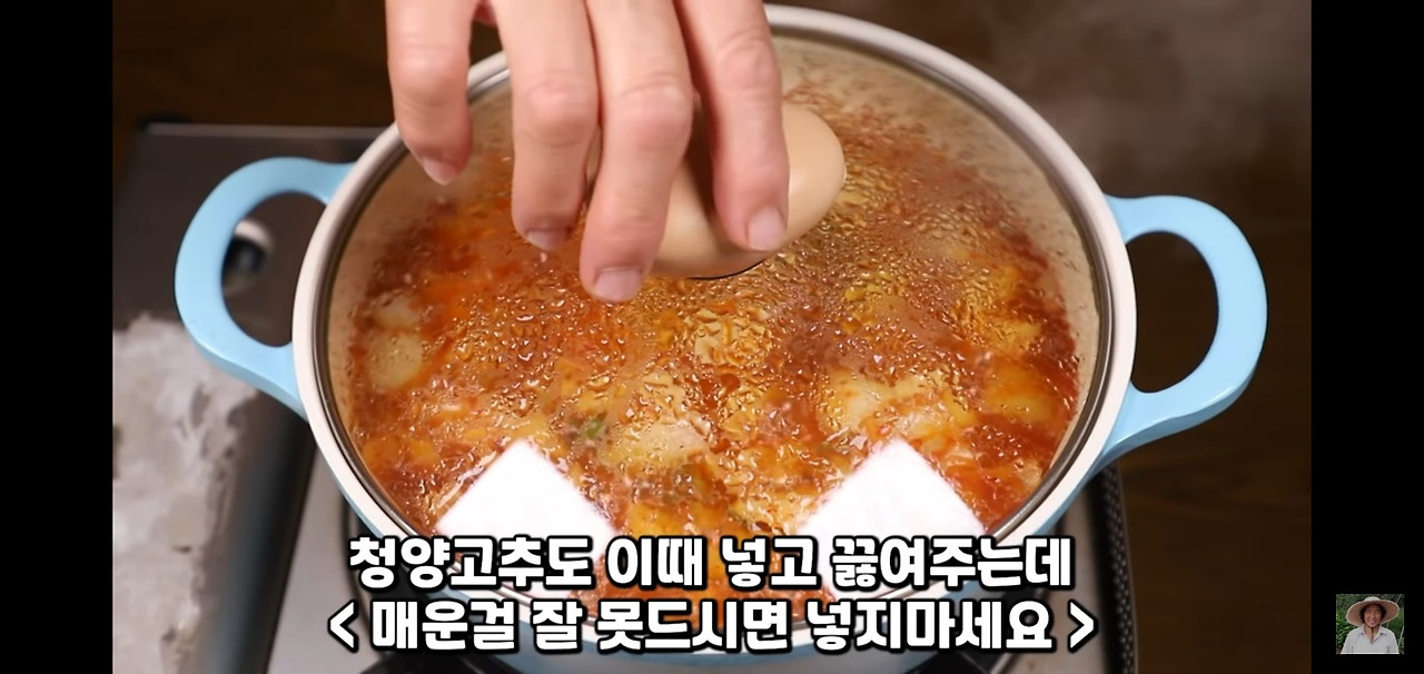 물을 넣으면서 감자 짜글이에 매콤한 향을 더해줄 고추도 함께 넣고, 냄비를 덮어 6분간 끓여주세요.