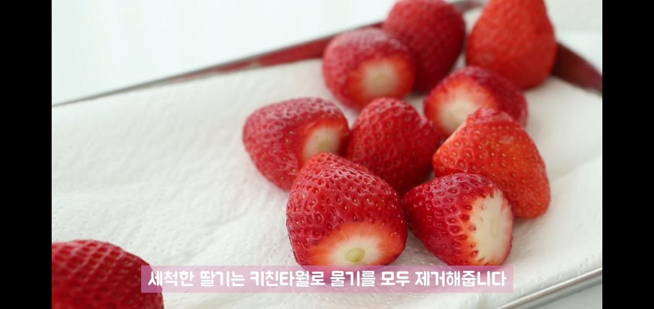 깨끗하게 씻은 딸기는 키친타올로 물기를 잘 닦아주세요.