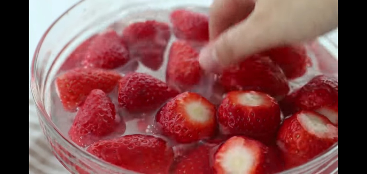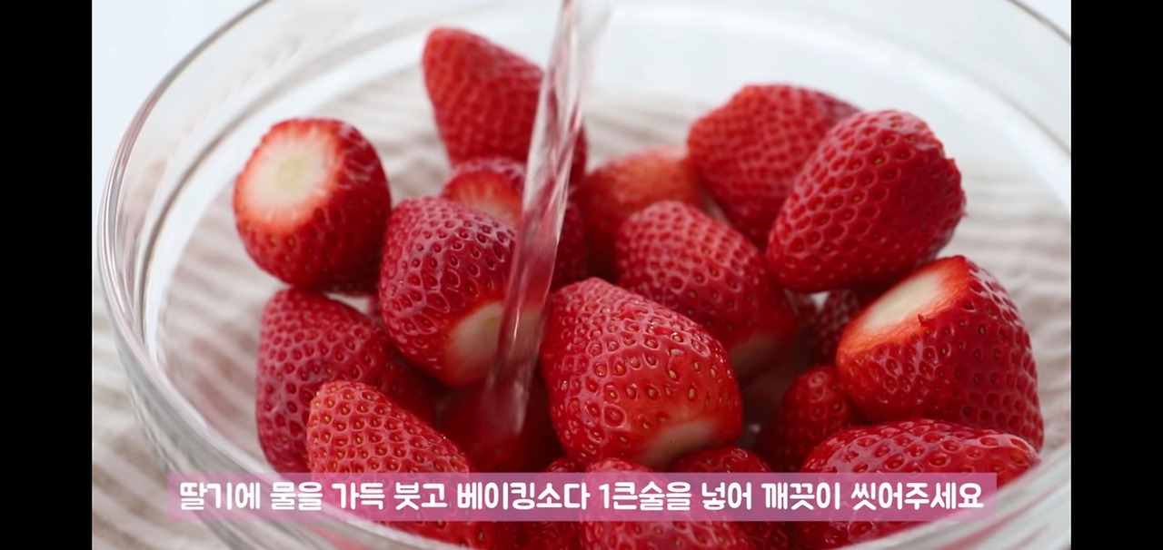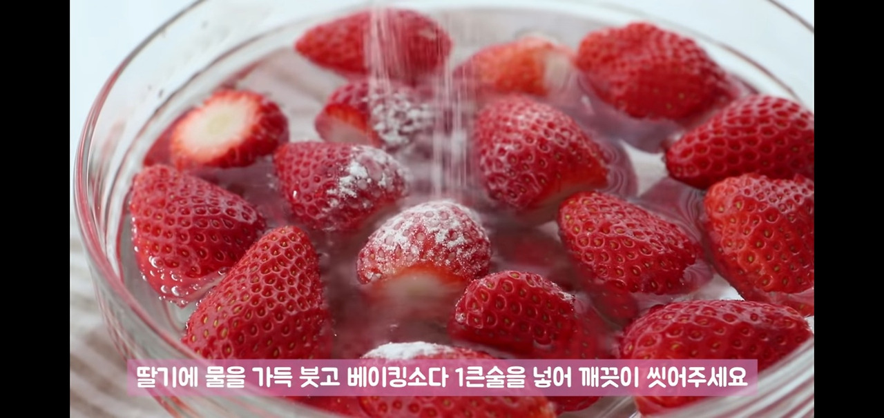 그 다음, 그릇에 딸기를 담고 물을 부은 후, 베이킹소다 1스푼을 넣어 깨끗하게 씻어주세요.