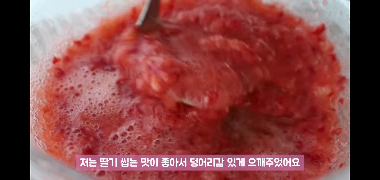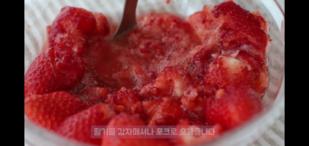 포크나 감자 매셔를 이용해 딸기를 적당히 으깨주세요. 믹서기처럼 너무 곱게 으깨지지 않도록, 씹히는 맛이 남을 정도로 으깨는 것이 더 좋습니다!