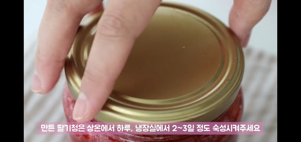 이렇게 해서 오늘 만든 딸기청이 완성됐습니다. 예쁜 통에 담아서 실온에서 하루, 냉장고에서 2~3일 정도 숙성시키면 더욱 맛있게 즐기실 수 있어요.