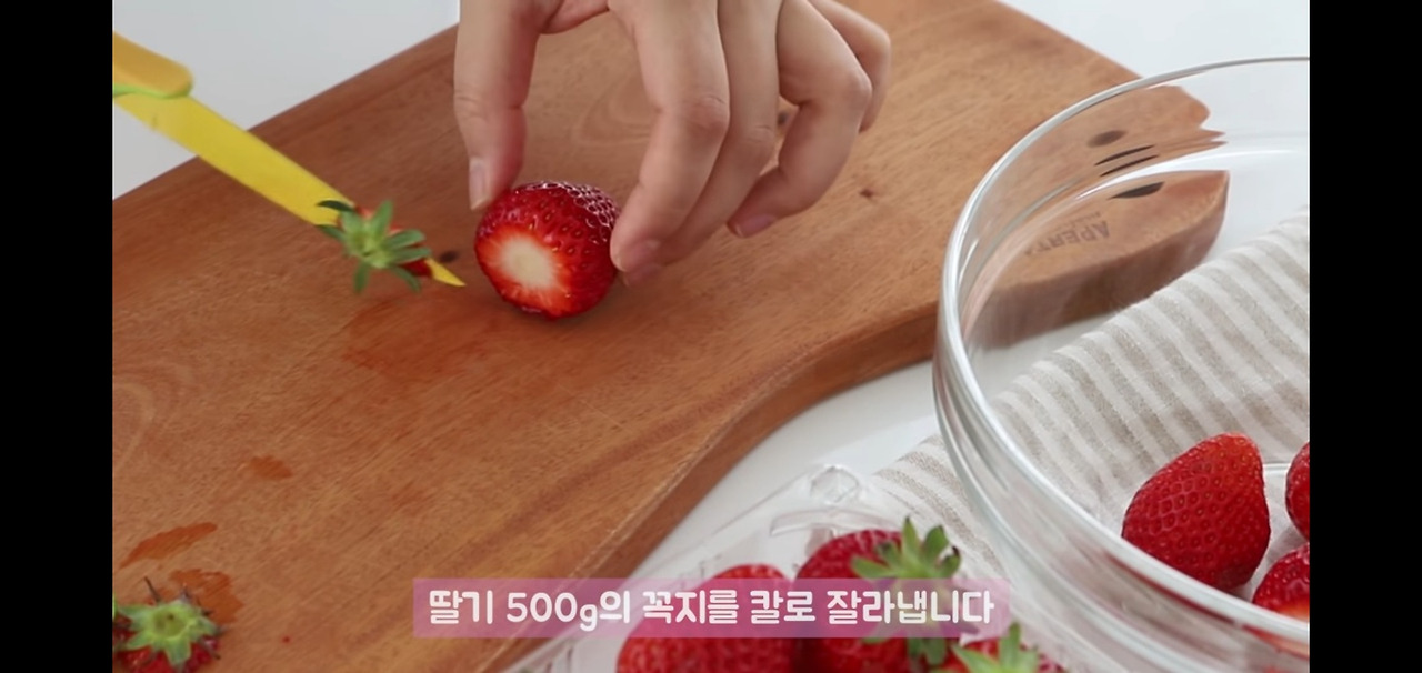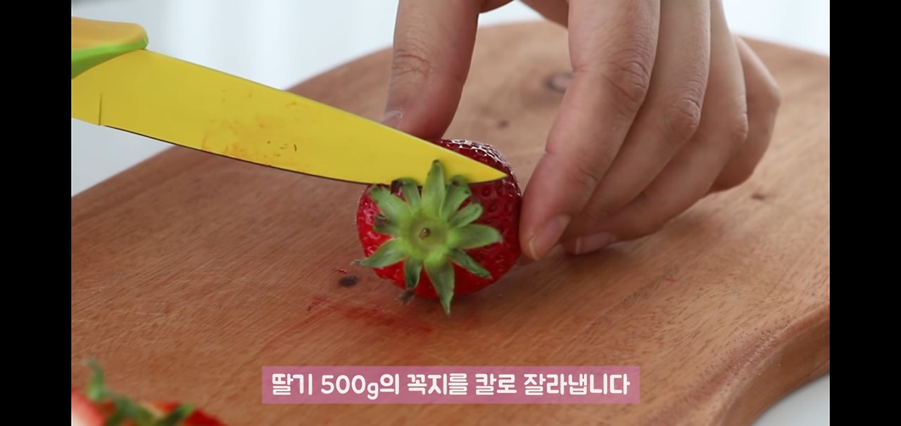 딸기의 꼭지와 주변에 있는 하얗고 질긴 부분을 칼로 깔끔하게 잘라주세요.