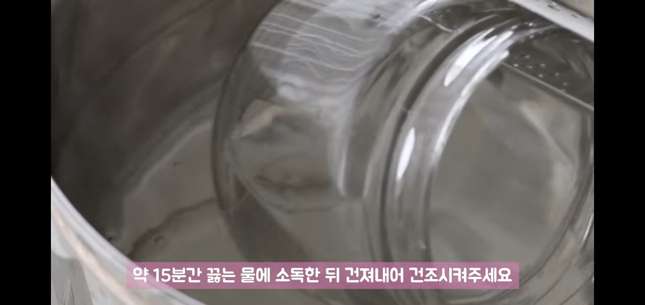 약 15분 정도 끓여 소독한 후, 유리병을 꺼내어 말려주세요. 이때 뜨거우니 집게를 사용하시는 것이 좋습니다.