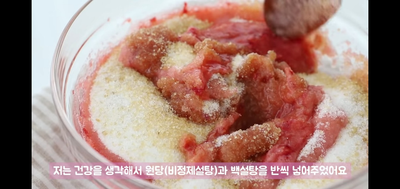 으깬 딸기에 설탕 500g을 넣어주세요. 저는 백설탕 250g과 원당 250g을 섞어 넣었답니다.
