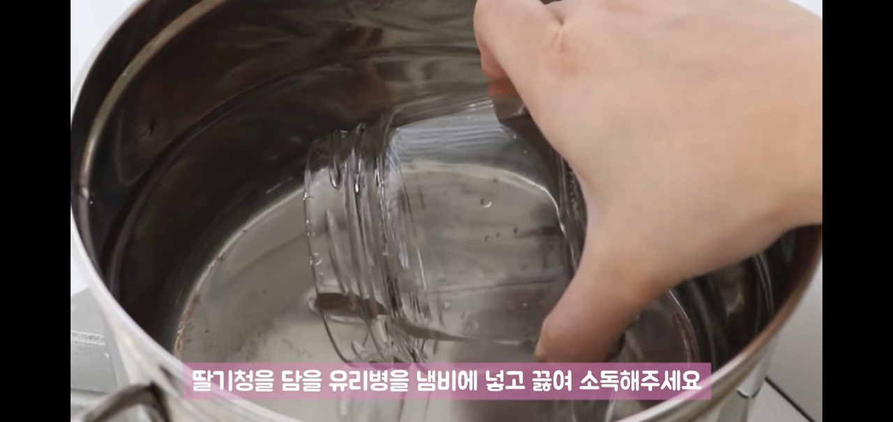 딸기청은 적당한 크기의 유리병에 담는 것이 좋습니다. 유리병을 냄비에 넣고 끓여서 깨끗하게 소독해 주세요.