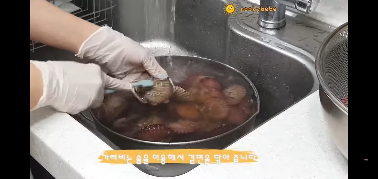 어두운 소금물에서 1시간 동안 해감된 가리비는 수세미나 칫솔을 사용해 이물질을 깨끗하게 제거한 후, 흐르는 물에 잘 씻어 주세요.