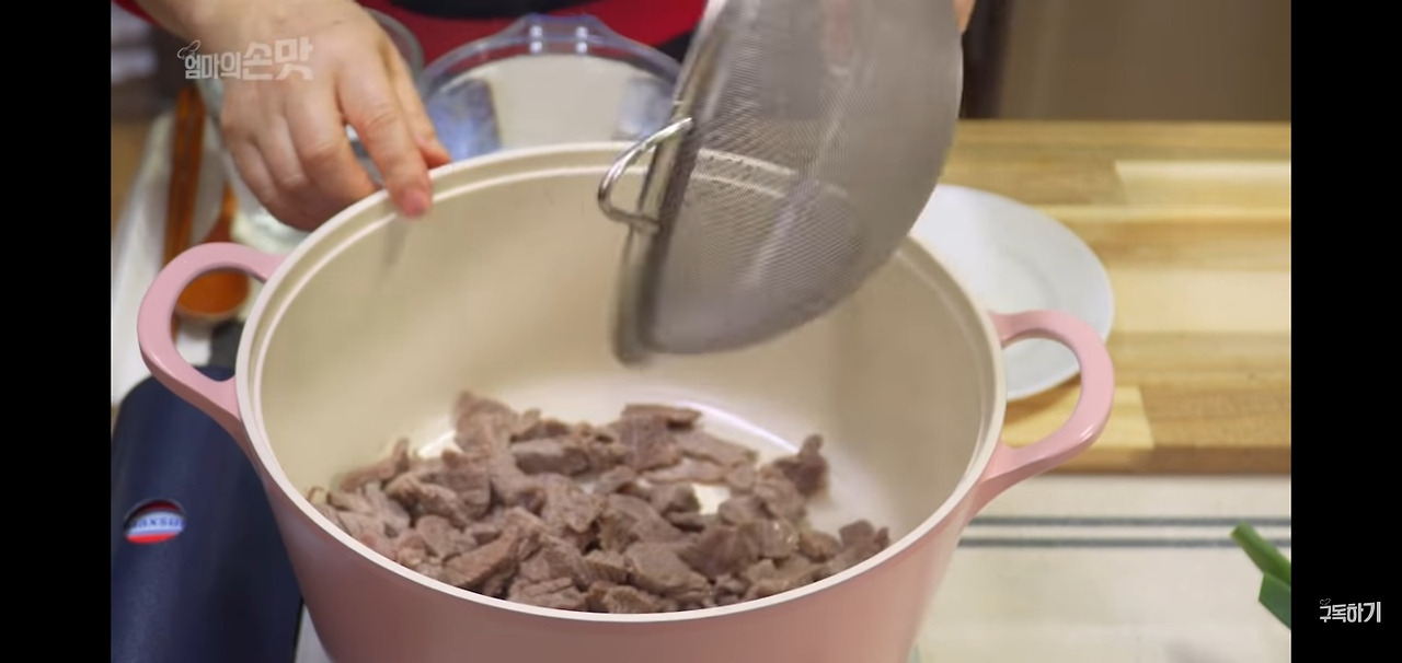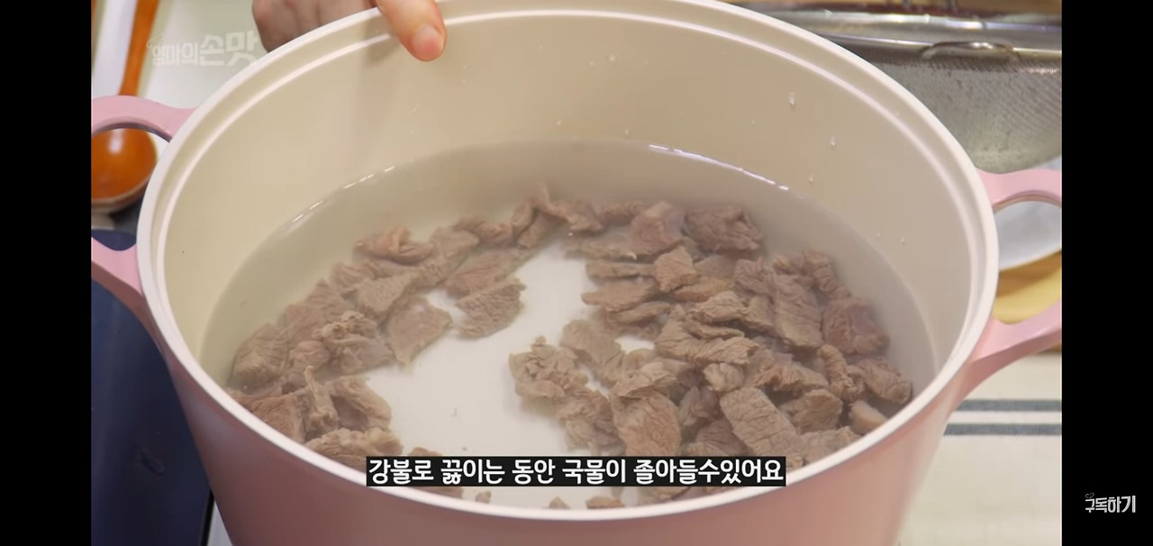 이제 데쳐 놓은 고기를 잘 익혀 주세요.