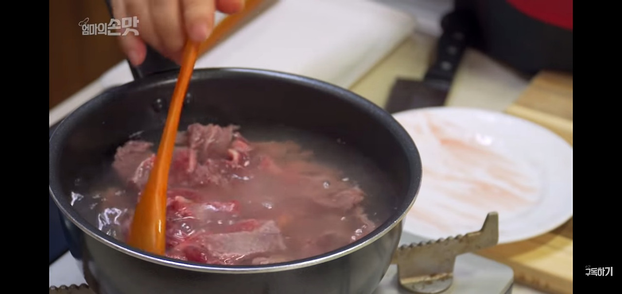 끓는 물에 썰어둔 고기를 넣고, 거품이 생길 때까지 끓여 주세요.