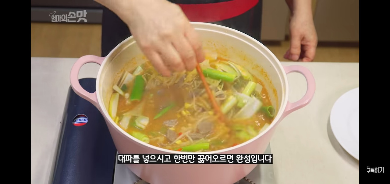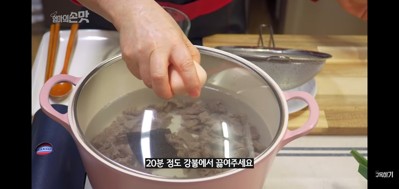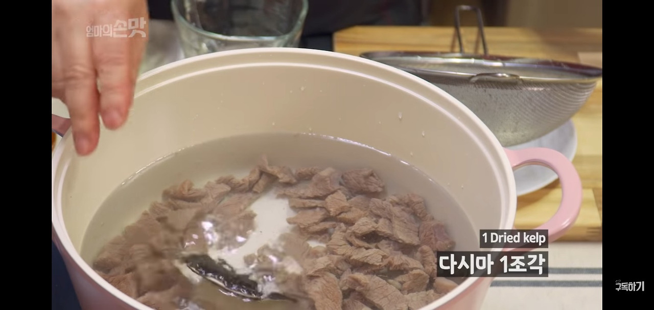 앞서 강한 불에서 끓인 고기 육수는 끓인 후 10분 정도 지나면 다시마를 건져내고, 그 후 10분 더 끓여주었어요.