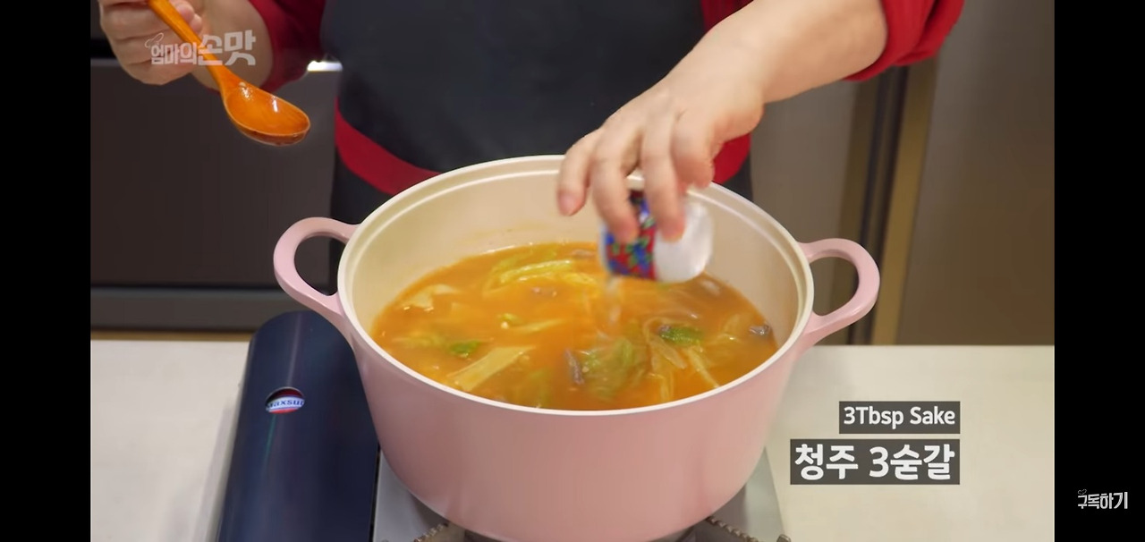 이제 양념한 우거지를 넣고, 청주를 3큰술 넣어주세요.