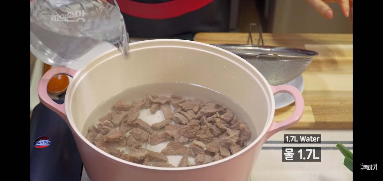 감칠맛이 나는 쌀뜨물을 사용하면 더욱 맛있어요. 깔끔하게 손질한 고기를 냄비에 넣고, 물 1.7L를 부어 주세요.