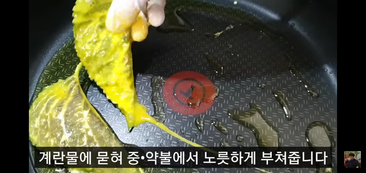 중약불로 달궈진 팬에 식용유를 둘러준 후, 깻잎에 계란물을 충분히 묻혀서 노릇노릇하게 구워주세요.