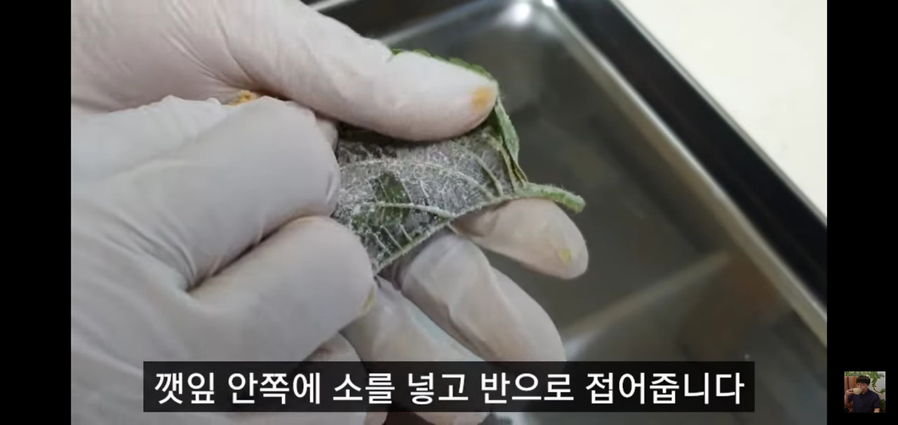 이제 준비한 깻잎전 속 재료를 깻잎에 넣어주세요.
