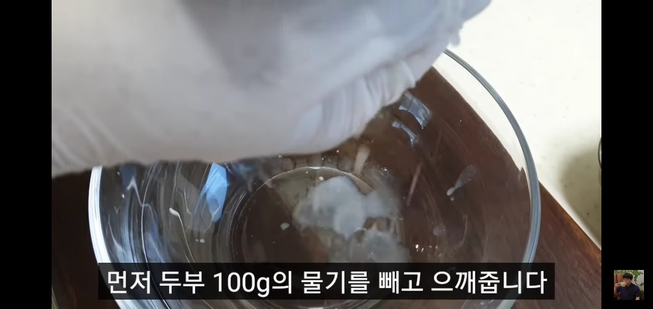 두부 100g은 물기를 충분히 제거한 후 잘 으깨서 그릇에 담아주세요.