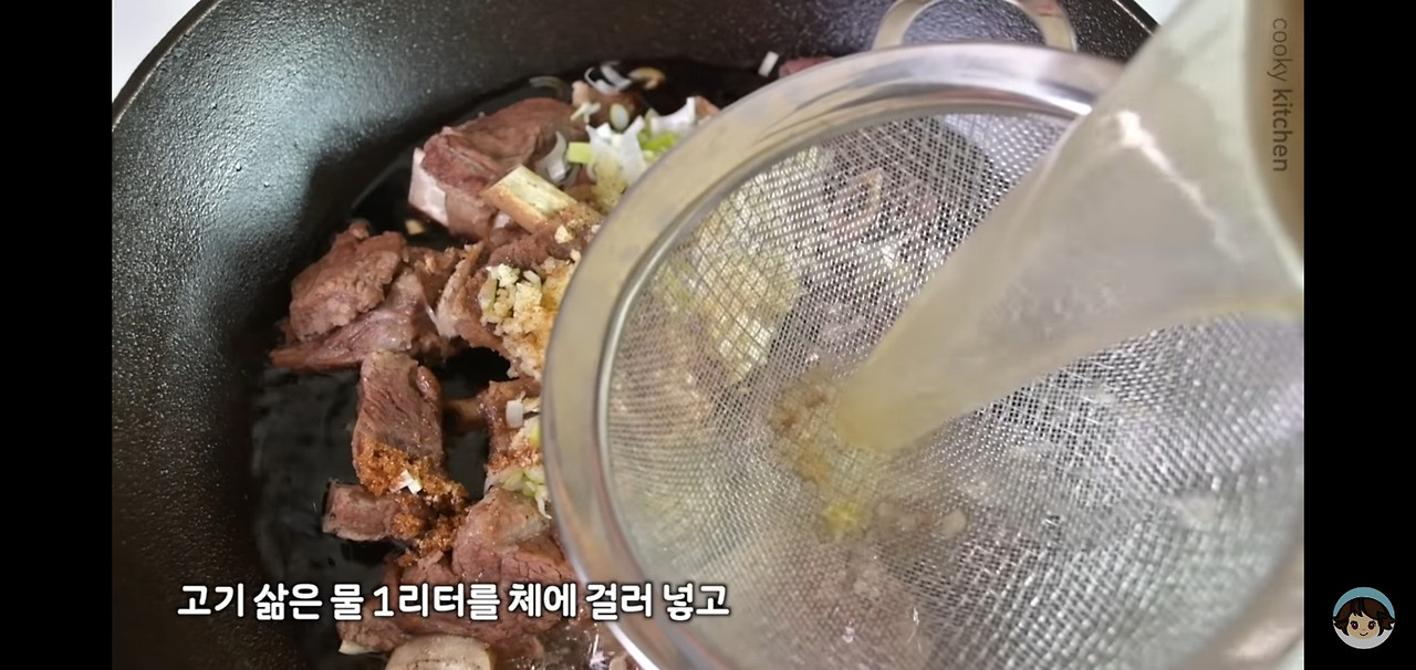 앞서 고기 삶은 물 1L를 채에 걸러서 넣어 주세요.